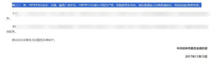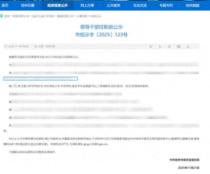 今年11月24日,广西桂林当地媒体发布了一则《领导干部任职前公示》,发布单位是桂林市委组织部中国股票配资网平台官网,落款时间为2025年11月21日。