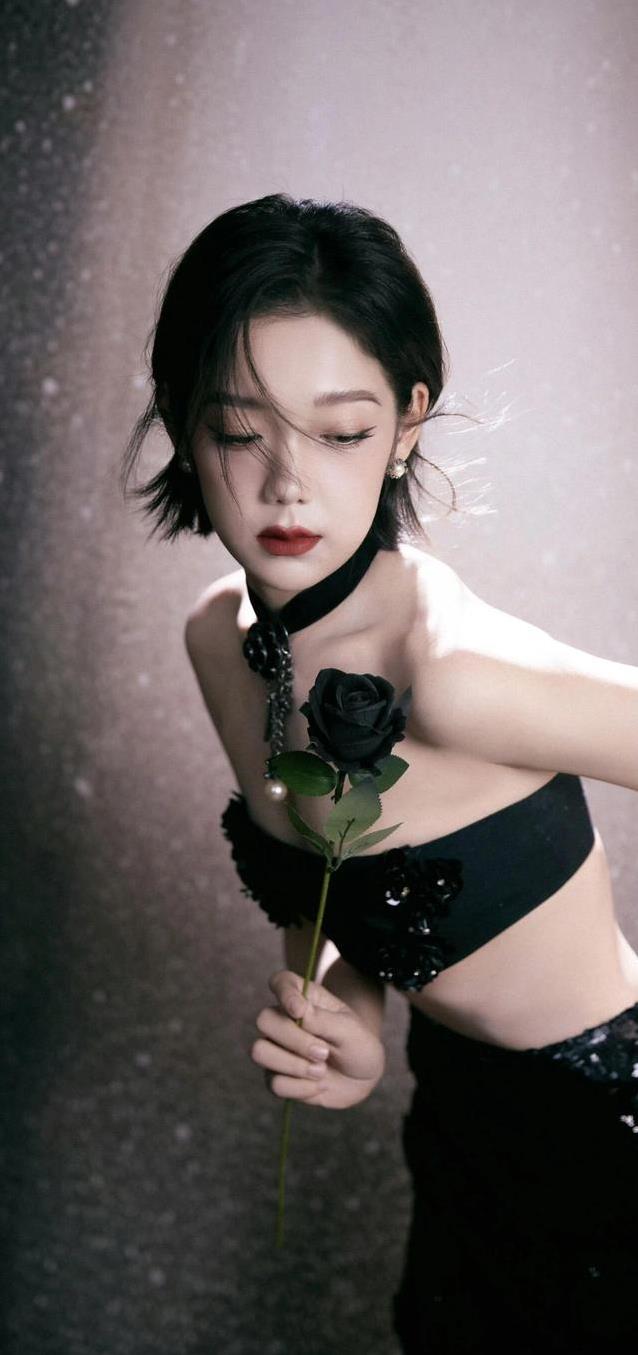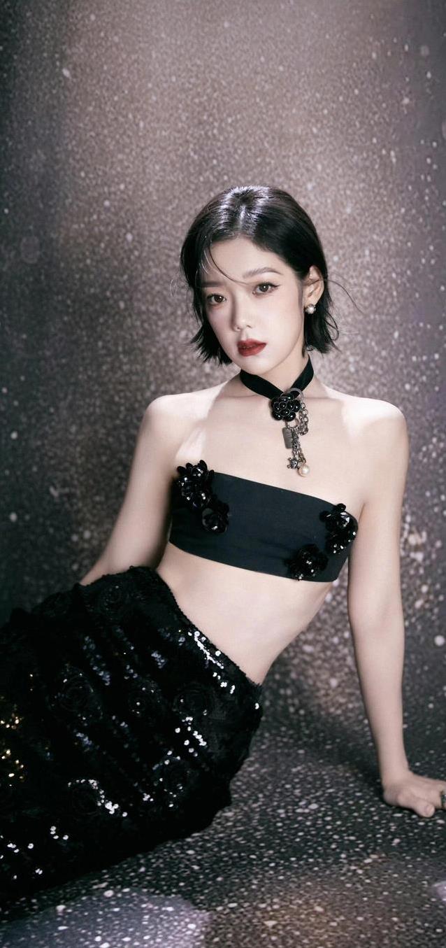 另一组黑色抹胸长裙的造型,让人联想到优雅的黑天鹅。裙身贴合身形,勾勒出流畅的线条,腰侧的蝴蝶结增添了几分柔和的优雅。露肩的设计突出了肩颈的自然曲线,整个人显得高贵又有气势。